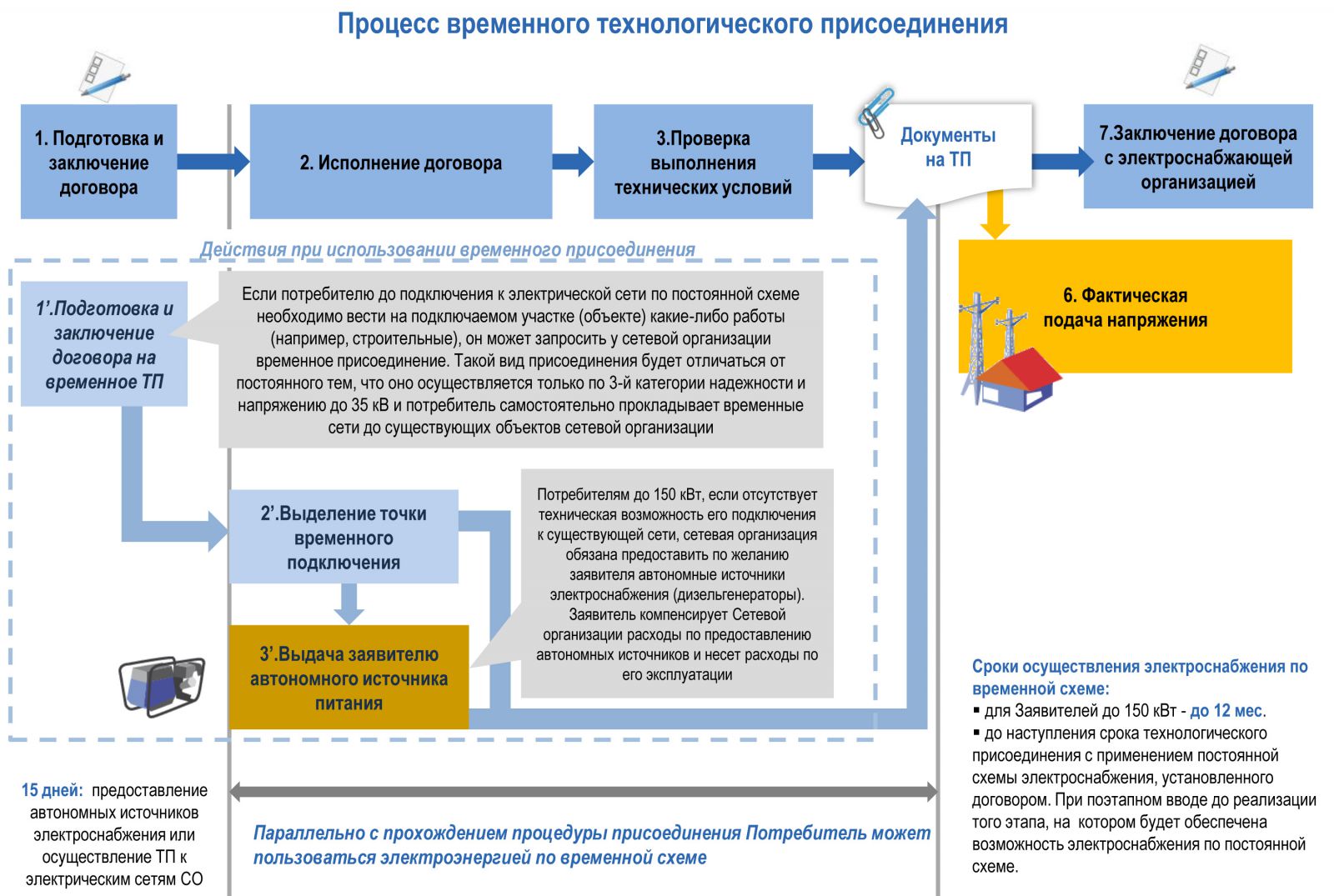 Временное технологическое присоединение, а также заключение и исполнение договоров об осуществлении временного технологического присоединения, на основании которых оно производится, осуществляется в соответствии с предусмотренным Правилами технологического присоединения общим порядком технологического присоединения с учетом особенностей, установленных в настоящем разделе.