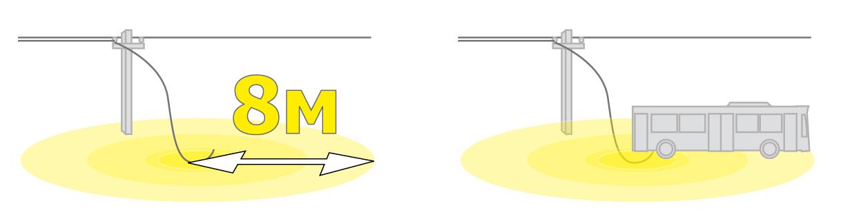 Из оборванного провода по грунту расходятся невидимые концентрические круги электрического напряжения – электричество как бы «растекается» по почве. В точке вхождения тока в землю наблюдается высокое напряжение (потенциал равен потенциалу на проводе). По мере удаления от этой точки напряжение снижается и на краю круга оно равно практически нулю.
